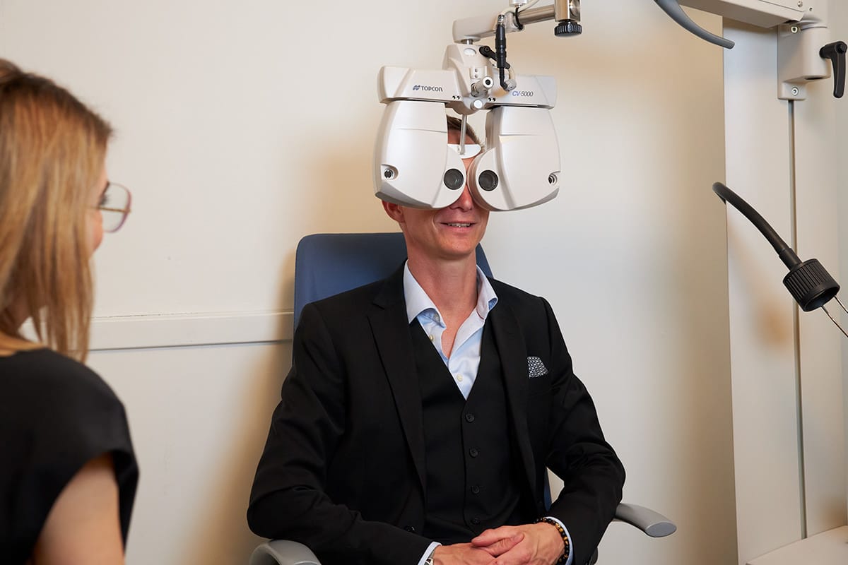 Du kommer att placeras bakom en maskin kallad foropter där du får bedöma vilka glas som ger dig bäst synskärpa genom att titta på en digital syntavla. Vi ser till att hitta rätt styrka och korrigerar för eventuella brytningsfel (astigmatism).